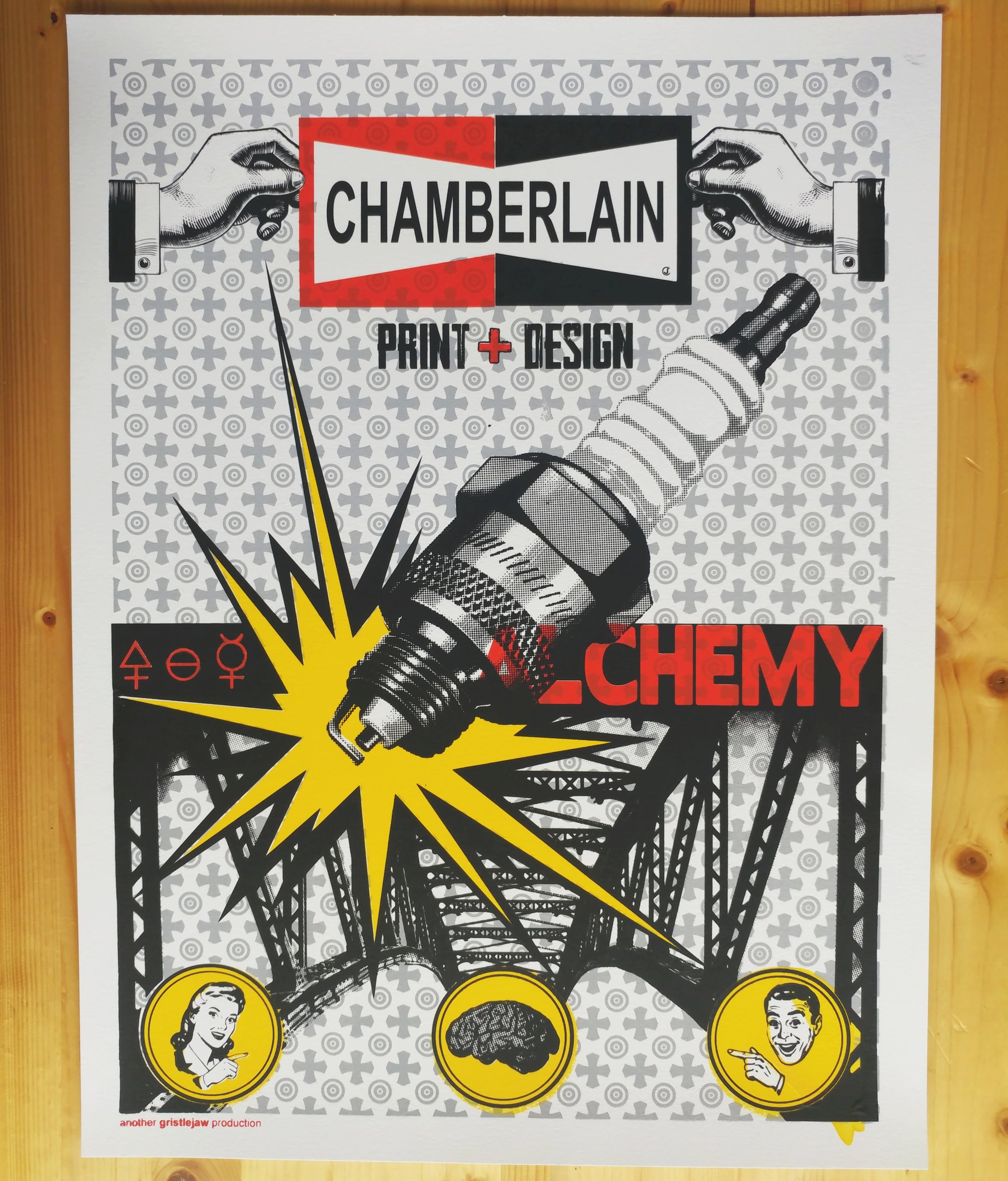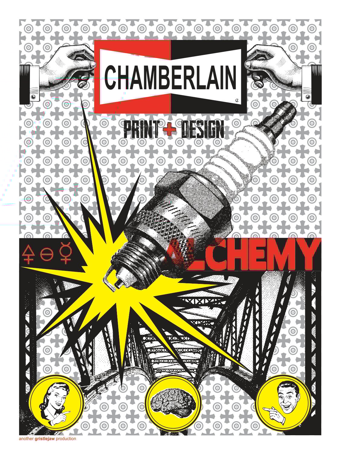 The inaugural print from Chamberlain Print & Design. An exploration of Pop art and mystic symbolism mixed with electrifying automotive nostalgia. This is a 4-color print hand-screened by the artist. Limited run: Signed & numbered edition of 22 prints. Image is 16" x 22" on heavyweight 140 lb. 18" x 24" paper. Poster will only ship in a mailing tube. You must purchase a mailing tube if you do not already have one in your cart.