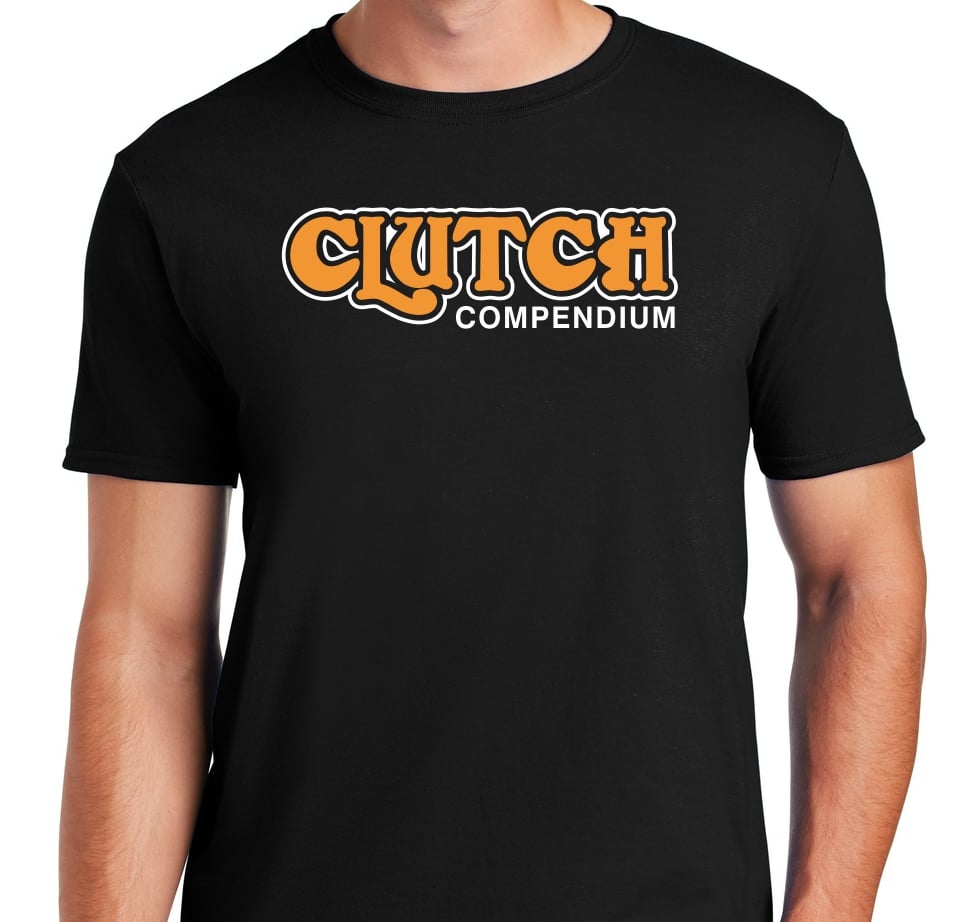 CLUTCH COMPENDIUM LOGO T-SHIRT (ORANGE & WHITE on BLACK)