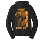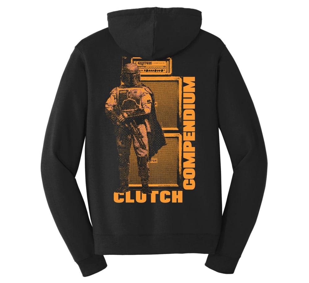 Revised BOUNTY HUNTER design with a 3-location all-orange print that includes Clutch Compendium logo on front, the armor-clad bounty hunter lettering on back and "Never Look A Bounty Hunter In The Eye, Damn!" on the right sleeve; all on a black 8.5 oz. zip-up hoodie (80/20 blend). Proceeds from shirt sales goes towards continuation of fun contests like the annual Clutch Trivia Contest.