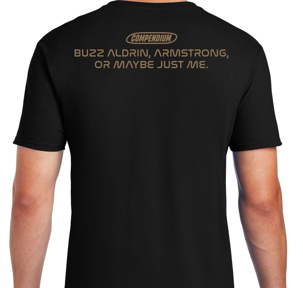 Features the cover art of the Live compilation by the Compendium 'Self-Titled Live'. Two location print (Compendium Oval logo and lyrical content that includes a NASA nod on back) on black unisex/men's softstyle tee.