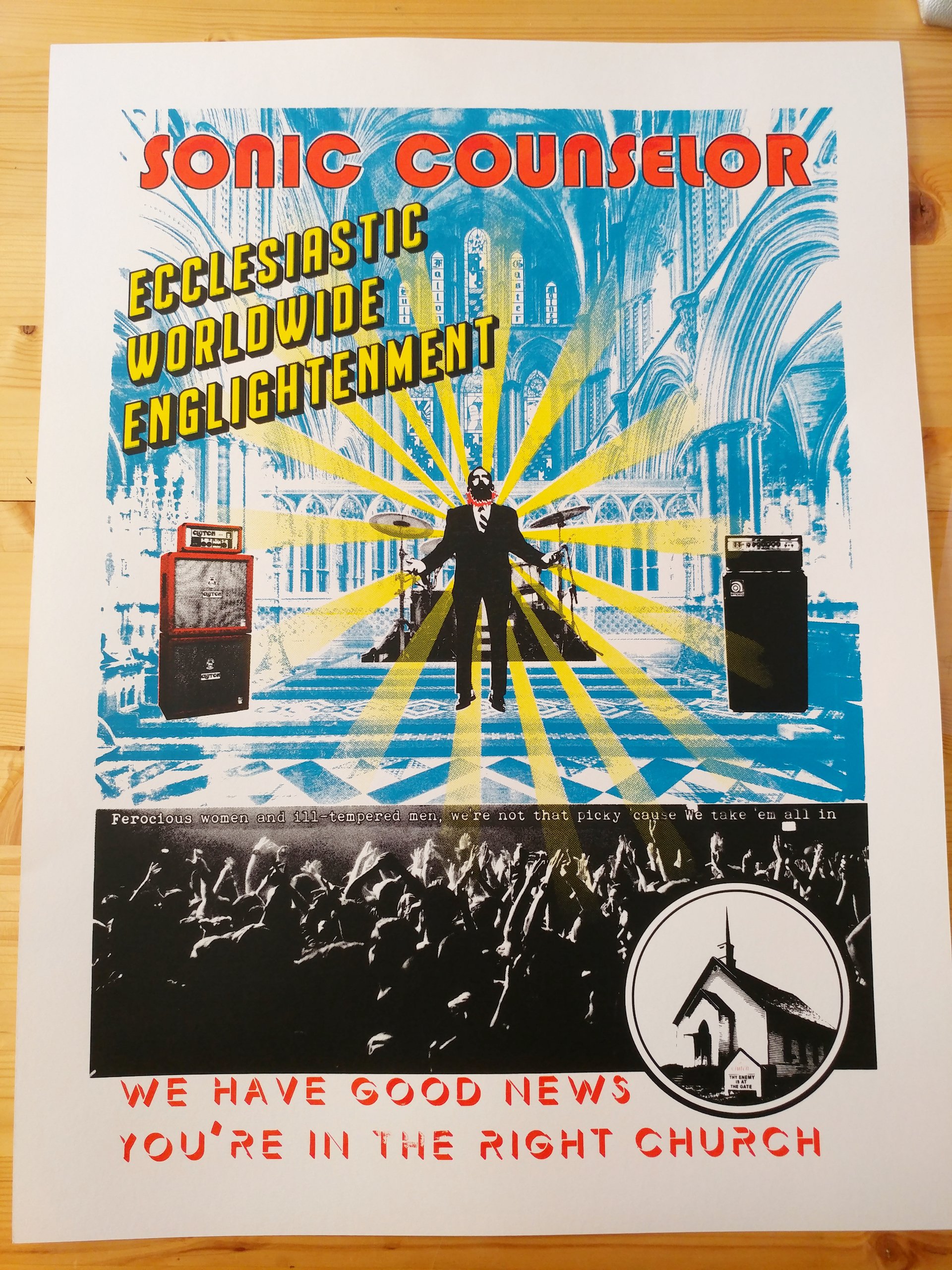 A poster inspired by Clutch’s Sonic Counselor. A song from their 2018 album “Book of Bad Decisions” that pays tribute to Clutch’s die-hard fans, aptly named ‘Gearheads’. Lead singer Neil Fallon had this to say about their fans, “Whether it’s Birmingham, Alabama or Birmingham, UK, there’s a camaraderie that is almost church-like. People sometimes say, ‘You’re like a preacher onstage’, but I think it has more to do with the congregation than the people onstage and treating the show as a special, sanctified event every night.” [Regarding the lyrics to Sonic Counselor…] “It's a tip of the hat to them. We're exceptionally lucky to have the fans we have.”